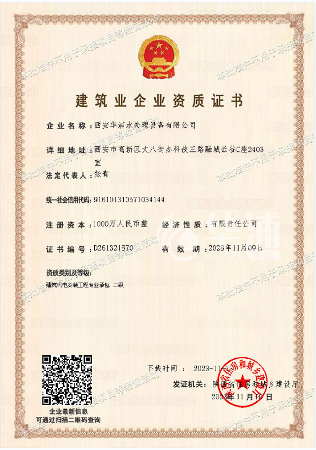 近日,西安華浦環(huán)保水處理設(shè)備有限公司建筑機(jī)電安裝工程資質(zhì)升為二級。此次資質(zhì)等級的提升,使我司資質(zhì)等級和專業(yè)水平又上了一個新臺階,進(jìn)一步增強(qiáng)了公司的市場競爭能力,為公司做大做強(qiáng)打下了堅實的基礎(chǔ)。