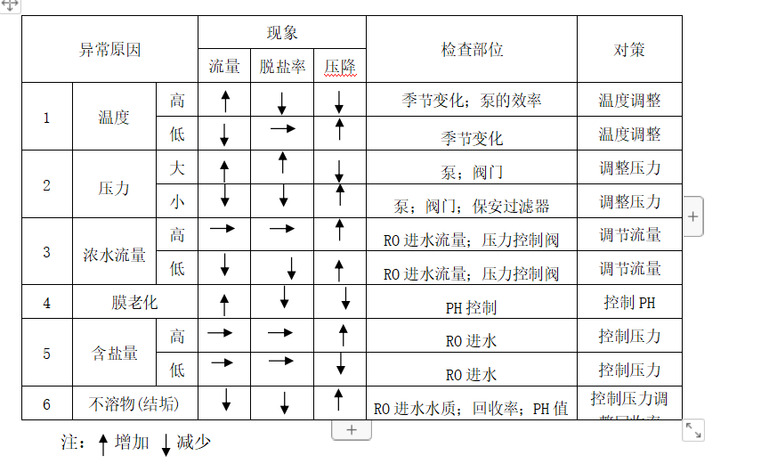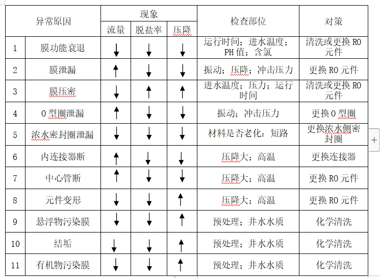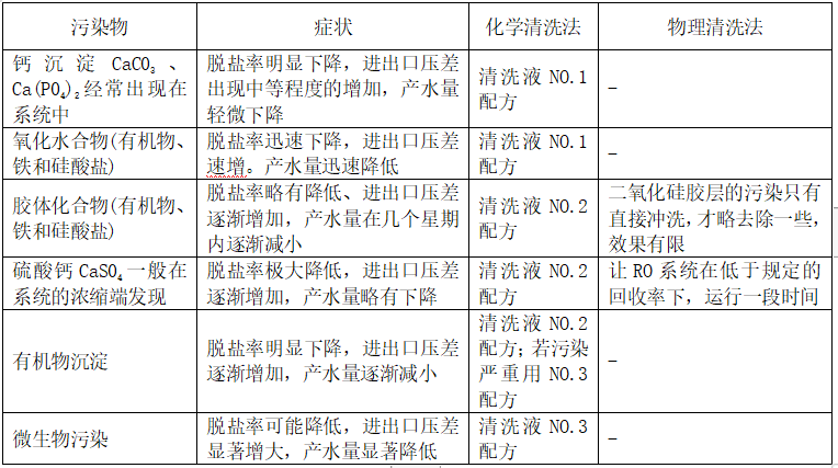(1)裝置運(yùn)行時(shí)如出現(xiàn)以下任一情況,則必須立即進(jìn)行化學(xué)清洗。(在標(biāo)準(zhǔn)條件下,即壓力1.5MPa, 水溫25℃, 回收率75%)
