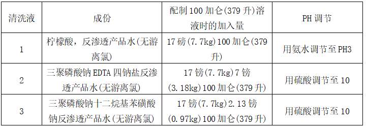 (b) 清洗液最高溫度為30℃,最高壓力為3.5kg/cm2,每一段清洗時(shí)間為45分鐘,用反滲透產(chǎn)水或無離子水配制溶液,溶液混合要均勻。